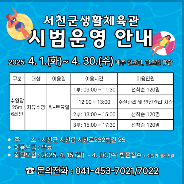 서천읍 서천로232번길 25에 자리한 서천군생활체육관은 지하 1층에서 지상 2층 규모, 연면적 3,138.24㎡로 건립됐으며, 시범운영 기간에는 수영장과 헬스장 시설이 주민들에게 개방된다.