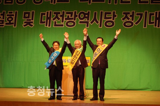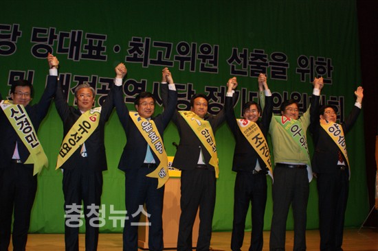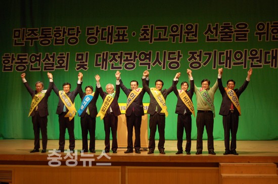 대전시당 정기대의원 대회 의장 선출 (차기 대의원대회까지 임기) 18일 대전 컨벤션 센터 문희상 비대위원장, 이낙연 선거관리위원장, 대표 후보으로 나선 강기정, 김한길, 이용섭 최고위원 후보로 나선 양승조, 유성엽, 윤호중, 안민석, 조경태, 우원식후보가 지지를 호소했다.