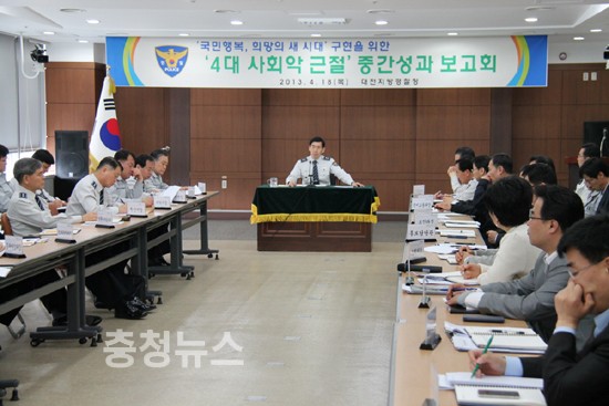대전지방경찰청(청장 정용선)은 18일 오전 6층 대회의실에서 청장, 각 과장․담당관, 全계장, 대전시 內 5개 경찰서장 및 여청․생안․수사․형사과장 등이 참석한 가운데, ‘4대 사회악 근절, 중간성과 추진보고 및 토론회’를 개최했다.