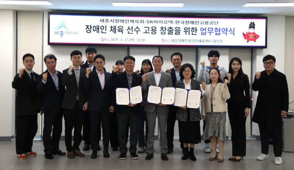 [충청뉴스 최형순 기자] 세종특별자치시장애인체육회(회장 최민호)는 27일 세종장애인형국민체육센터에서 SK바이오텍, 한국장애인고용공단 대전지역본부와 장애인 체육 선수 채용 확대를 위한 협약을 체결했다.