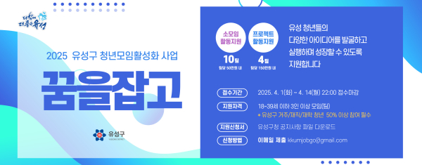 참여를 희망하는 청년 모임은 4월 1일부터 14일까지 이메일로 신청서를 제출하면 된다. 지원 자격 및 선발 기준 등 자세한 내용은 유성구 홈페이지에서 확인할 수 있다.