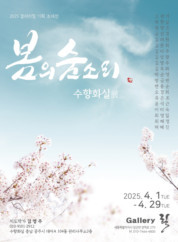 [충청뉴스 최형순 기자] 공주시 수향화실(대표 김영주 작가)은 4월 1일, 세종시 장군면에 위치한 갤러리 힐 초대로 봄맞이 회원 작품 전시회를 개최한다.