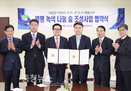 25일 서구청 다목적실에서 배재대학교(총장 김영호)와 월평 녹색 나눔 숲 조성사업 협약식을 체결했다.