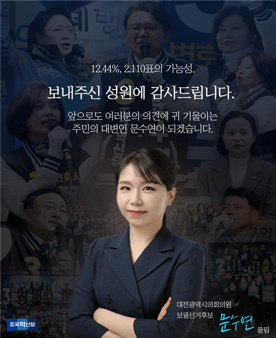 대전시의원(유성2) 보궐선거에서 예상 밖 선전을 펼친 조국혁신당 문수연 후보가 낙선 인사를 전했다.