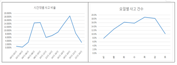 전세버스 교통사고의 주요 특성을 살펴보면, 시간대별로는 오후 6시~오후 8시가 18.5%로 가장 많았고, 이어 오전 8시~오전 10시 14.6% 순으로 주로 오전과 저녁 시간대 사고가 집중됐다. 요일별로는 목요일 18.9%, 금요일 18.3%로 주중 후반에 사고율이 높았다.