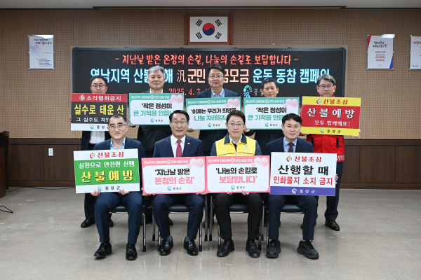 [충청뉴스 권상재 기자] 홍성군은 7일 영남지역 산불 피해 주민들을 돕기 위한 범 군민 성금모금 운동의 일환으로, 군청 회의실에서 ‘영남지역 산불피해 汎 군민 성금모금 운동 동참 캠페인’을 개최했다고 밝혔다.