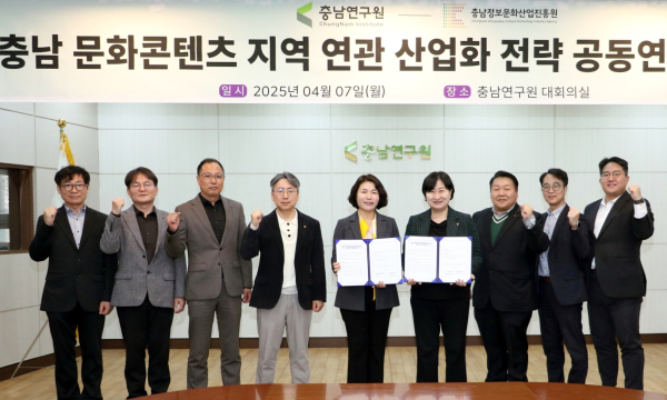 전희경 충남연구원장은 “문화산업 브랜드 차별성은 지역사회 발전과 도민 삶의 질에 많은 영향을 미칠 것”이라며 “공동연구를 통해 지역 역사·문화·산업을 조화롭게 엮은 전략을 마련하길 바란다”고 밝혔다.