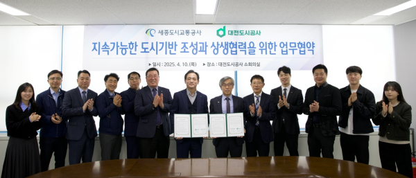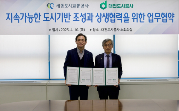 [충청뉴스 최형순 기자] 세종도시교통공사(사장 도순구)는 10일 대전도시공사(사장 정국영)와 대전도시공사 본사에서 ‘지속가능한 도시 기반 조성과 지역 간 상생 협력’을 위한 업무협약(MOU)을 체결했다.