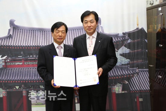 최석원 백제문화제추진위원회 위원장이 30일 이의성 하이트진로㈜ 대전충청강원권영업본부장에게 제59회 백제문화제 후원사 인증서를 전달하고 있다.
