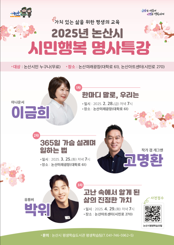 한편, 시민행복 명사특강은 논산시민이라면 누구든지 참여할 수 있으며, ‘논산시 평생학습 포털 홈페이지(https://lllcity.nonsan.go.kr)’를 통해 사전 접수한다.