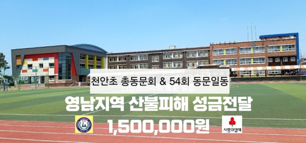 이종화 천안초 총동창회장은 "선배들의 자발적 모임에 총동창회도 작은 마음을 모았다. 산불 피해로 큰 슬픔을 겪고 있을 분들께 조금이나마 도움이 됐으면 한다"며 "어려운 경제 상황에 나눔을 실천하는 것이 쉬운 일은 아니지만, 모두 함께 한다면 위기를 극복할 수 있을 것"이라고 말했다.