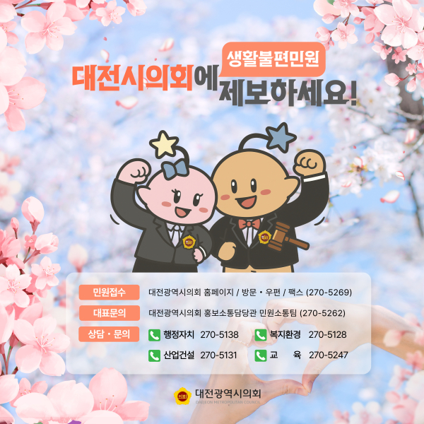 조원휘 의장은 “대전시의회는 시민들의 대의기관으로서 시민 불편 사항을 제보받아 처리하는 데 노력하고 있다”며 “살기 좋은 정주여건을 만들어가기 위해 시민과 소통하며 불편을 해소해 나가는 데 최선을 다할 것”이라고 말했다.