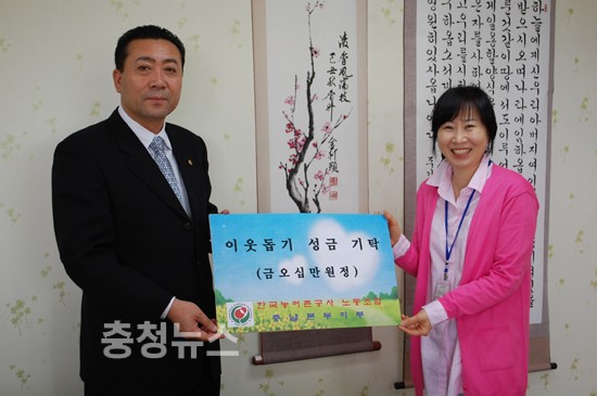 이번 성금은 김정일 노동조합 충남본부장이 지난달 19일 취임함에 따라 지인들로부터 받은 축하와 격려의 화분 50여개를 직원들에게 1만원의 저렴한 가격으로 판매한 수익금으로 마련했다.