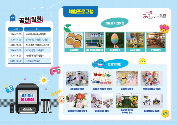 체험 프로그램으로는 ▲매직 버블쇼 ▲달고나 뽑기 ▲대형 트램펄린(방방이) ▲솜사탕 만들기 ▲스프링 말타기 ▲추억의 문방구 ▲머리띠·인형·브로치·카네이션 만들기 등이 운영된다.