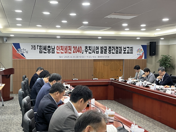 [충청뉴스 박영환 기자] 충남도는 25일 도청 중회의실에서 신동헌 도 자치안전실장 주재로 ‘힘쎈충남 안전비전 2040 추진사업 발굴 중간결과 보고회’를 개최해 176개(잠정) 과제를 발표했다고 밝혔다.