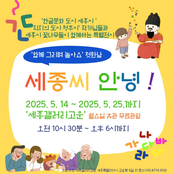 [충청뉴스 최형순 기자] 세종갤러리고운(관장 유보경)은 5월 가정의 달을 맞이하여 5월 14일(수)부터 5월 25일(일)까지 특별 기획전시 '세종씨 안녕! 함께 그리며 놀아요'를 개최한다.