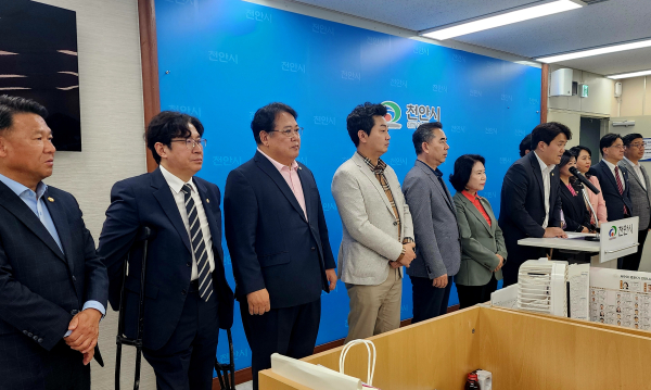 [충청뉴스 박동혁 기자] 국민의힘 소속 천안시의회 의원들은 30일 더불어민주당 소속인 천안 국회의원들을 향해 "민주당 이재명 대선 후보의 '국가AI컴퓨팅센터(이하 센터) 광주 설립' 발표에 동의하는지 밝히라"고 촉구했다.