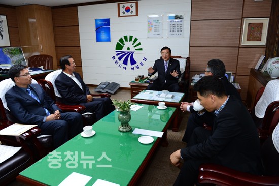 김석환 홍성군수가 지난 9일 오후 군수실에서 내포신도시 내 롯데캐슬아파트 입주민 대표와의 간담회를 갖고, 신도시 입주민들의 생활상의 불편해소에 최선을 다하겠다는 뜻을 피력했다.