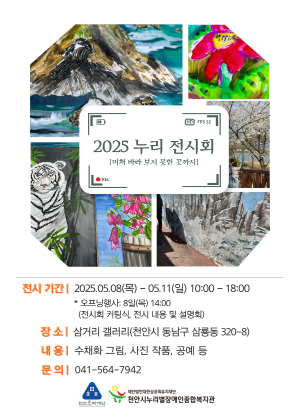 [충청뉴스 최형순 기자] 천안시누리별장애인종합복지관(관장 김경준)은 오는 8일 ~ 11일까지 오전 10시부터 오후 6시까지 천안시 삼거리갤러리에서 특별한 예술 전시회, ‘2025 누리전시회’를 개최한다.