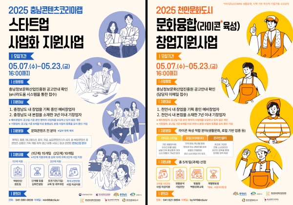 라이콘 분야에서는 ‘천안문화도시 문화융합(라이콘 육성) 창업지원사업’을 통해 천안시 내 예비창업자와 창업 7년 이내 사업자를 지원한다.
