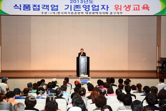 대전시 중구(구청장 박용갑)는 한국외식업중앙회 대전광역지회 중구지부 주관으로 지난 14일부터 16일까지 3일간 1,500여명 일반음식점 기존영업주에 대한 위생교육을 실시하며 영업상 필요한 법령의 개정사항 안내와 연중 발생우려가 있는 식중독 예방에 적극 나섰다.