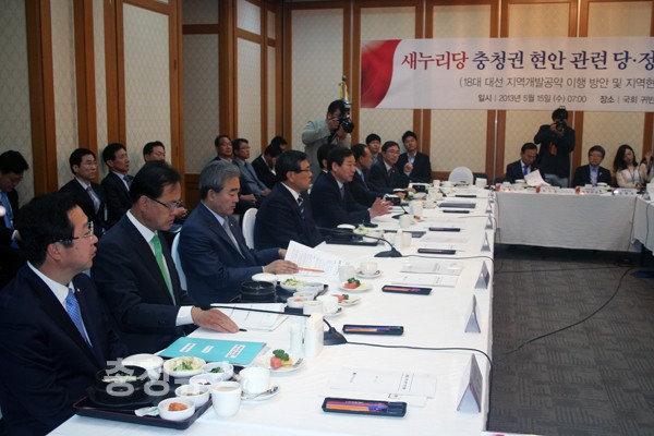 새누리당 충청권 국회의원 모임은 이날 국회 귀빈식당에서 미래창조과학부 최문기 장관, 안전행정부 유정복 장관, 문화체육관광부 유진룡 장관, 국토교통부 서승환 장관 등 4개 주요부처 장·차관들을 참석시킨 가운데 첫 당·정 조찬 간담회를 열었다.