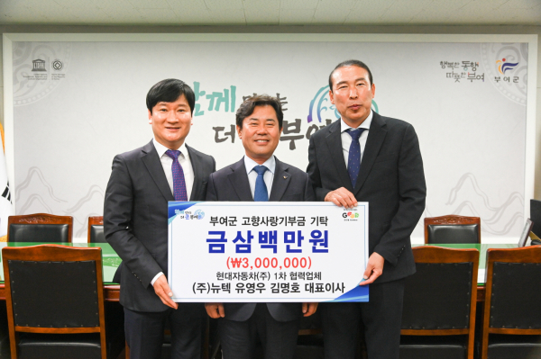 [충청뉴스 부여 = 조홍기 기자] 현대자동차 1차 협력업체로 자동차 부품을 제조하고 있는 (주)뉴텍이 부여군(군수 박정현)의 고향사랑기부제에 동참하며 지역 상생에 앞장서고 있다. 뉴텍은 지난 16일 부여군에 고향사랑기부금 300만 원을 기탁했다. 이번 기부는 유영우·김명호 공동대표가 지역 발전과 복지 증진에 보탬이 되기를 바라는 마음에서 자발적으로 이뤄진 것으로 알려졌다.
