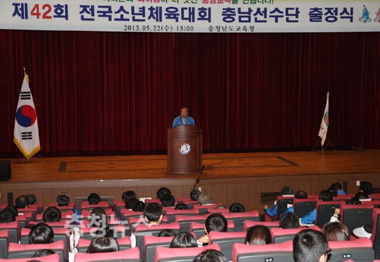충남도교육청(교육감 권한대행 부교육감 전찬환)은 22일 충남교육연수원 대강당에서 전찬환 충남교육감 권한대행, 충남도청 박정현 정무부지사, 충남도의회 교육위원회 이은철 위원장을 비롯한 도의회 교육의원, 서용제 충남도체육회 사무처장, (주)한승구 계룡건설 대표이사, 박준구 사립학교협의회장, 각 가맹경기단체장(전무이사), 각 시군 체육회 사무처장과 직속기관장, 교육장, 출전 학교장 및 지도교사, 출전선수, 체육계 인사 등 480여명이 참석한 가운데 '제42회 전국소년체육대회 출정식'을 개최했다.
