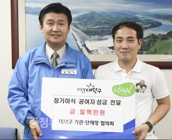 정용기 대덕구청장과 대덕구 공무원 등은 24일 구청 사랑방에서 투병 중인 장모 이수분(56) 씨를 위해 간을 이식해 준 김대호씨 부부를 초청해 직원들의 정성이 담긴 성금 300만 원을 전달했다.