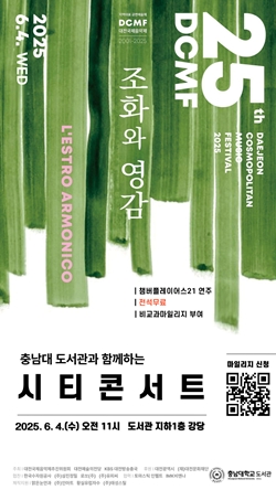 충남대 도서관은 오는 4일 중앙도서관 지하 1층 강당에서 제25회 대전국제음악제 ‘충남대 도서관과 함께하는 시티콘서트’를 개최한다.