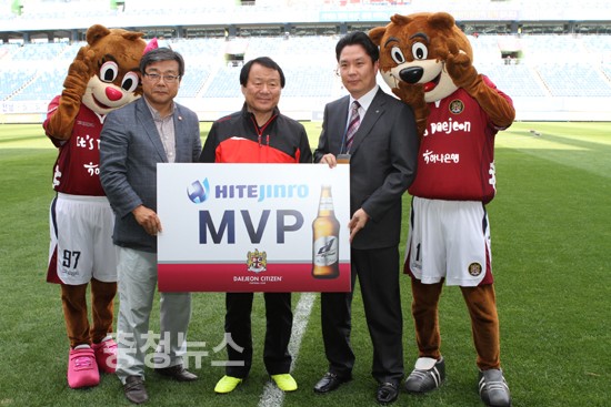 하이트진로(특판대전지점장 방상복)는 24일 K리그 클래식 13라운드 홈경기에 앞서 염홍철대전시티즌구단주, 전종구 대전시티즌 대표이사, 방상복 하이트진로 지점장과 대전시티즌의 12두번째 전사인 대전시민들이 참여한 가운데 대전월드컵경기장에서 '2013 하이트진로 MVP'상 후원협약식을 가졌다.