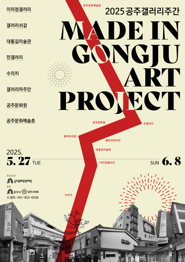 먼저 ‘2025 공주갤러리주간(MADE IN_Gongju Art Project)’은 각 갤러리 사이의 도보 5분 이내로 공주시 봉황동과 교동, 중동 등 왕도심 내 갤러리 8곳이 참여하여 다양한 기획전시가 진행되고 있다. 전체 프로그램의 참여작가는 22명으로 다양한 장르의 예술 작품을 한 번에 관람할 수 있는 행사로 지역 미술계 활성화에 기여하고 있다.