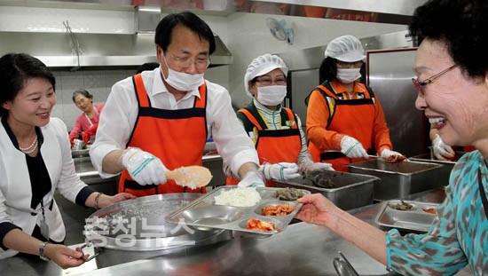 한 청장은 월 2회 가양2동 동구노인종합복지관과 판암2동 다기능노인종합복지관에서 급식봉사에 나서고 있다.