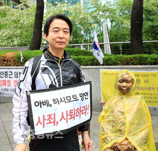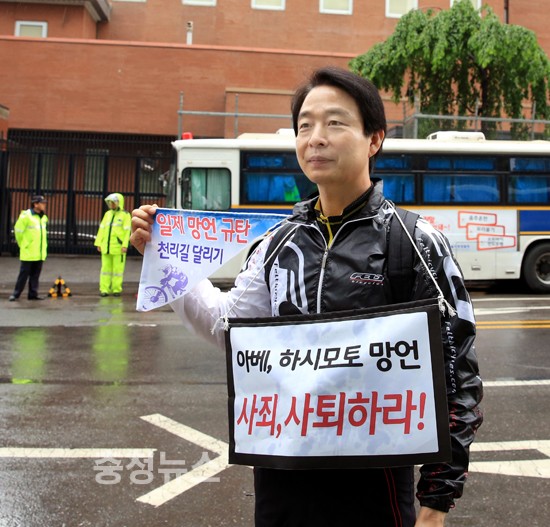 조신형 배재대학교 객원교수가 오늘(28일) 오후12시 일본 대사관 앞에서 일본 아베 총리 및 하시모토 오사카 시장의 망언을 규탄하는 1인 시위를 하고 자전거로 독도까지 일제망언을 규탄하는 차원에서 천리길을 달리기 시작했다.