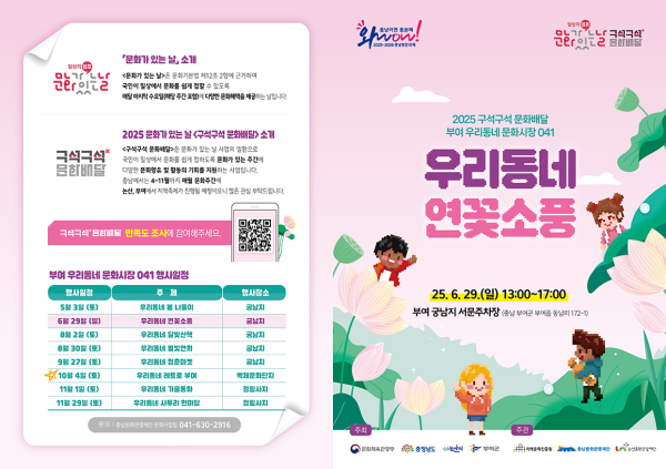 [충청뉴스 박영환 기자] 충남문화관광재단은 ‘문화가 있는 날’ 주간을 맞아 오는 6월 29일 부여 궁남지 서문주차장 일원에서 '2025 구석구석 문화배달 부여 2회차 우리동네 문화시장 041'을 개최한다고 23일 밝혔다.