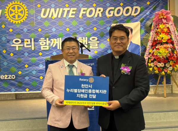 [충청뉴스 최형순 기자] 천안시누리별장애인종합복지관(관장 김경준)이 지난 24일 국제로타리 3620지구 천안일봉 로타리클럽(회장 금동 김은동)과 지역 내 장애인의 복지 증진을 위한 지원금 전달식을 가졌다.