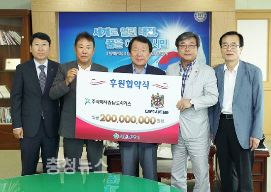 ㈜충남도시가스는 14일 오전 대전시를 방문해 대전시티즌 후원금 2억원을 기탁했다.