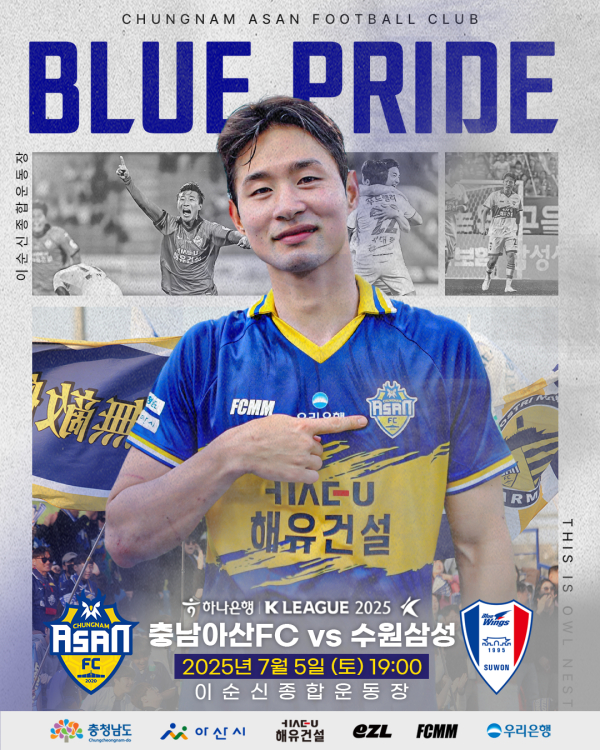 충남아산프로축구단(구단주 오세현, 대표이사 이준일, 이하 충남아산FC)은 5일 오후 7시 이순신종합운동장에서 열리는 하나은행 K리그2 2025 19라운드 홈경기에서 수원삼성블루윙즈와 격돌한다.