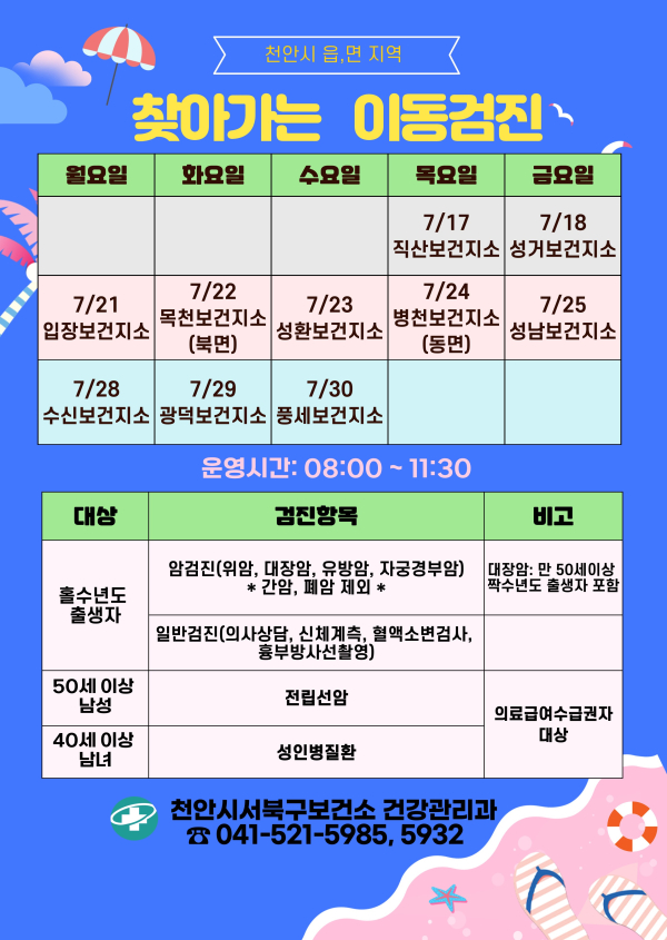 이동건강검진 일정은 ▲17일, 직산보건지소 ▲18일, 성거보건지소 ▲21일, 입장보건지소 ▲22일, 목천보건지소 ▲23일, 성환보건지소 ▲24일, 병천보건지소 ▲25일, 성남보건지소 ▲28일, 수신보건지소 ▲29일, 광덕보건지소 ▲30일, 풍세보건지소 순서로 진행한다.