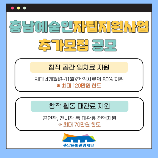 [충청뉴스 박영환 기자] 충남문화관광재단은 ‘2025 충남 예술인 자립지원사업 창작공간 임차료·창작활동 대관료’ 공모 사업을 7월 21일까지 추가 접수한다고 밝혔다.