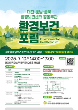 [충청뉴스 이성현 기자] 대전대학교 대전환경보건센터가 충남환경보건센터, 충북환경보건센터와 오는 10일 ‘권역별 지역환경보건계획의 현황과 환경보건센터 역할’을 주제로 공동포럼을 개최한다고 밝혔다.
