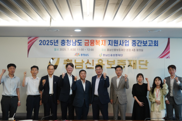 [충청뉴스 박영환 기자] 충남신용보증재단은 지난 8일 본점 회의실에서 '2025년 충청남도 금융복지 지원사업'의 중간보고회를 개최하고 상반기 사업 추진성과 공유 및 향후 추진 방향을 논의했다고 밝혔다.
