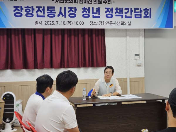 [충청뉴스 서천 = 조홍기 기자] 서천군의회 김아진 부의장은 7월 10일, 장항전통시장 상인회 회의실에서 시장 먹거리동의 리모델링과 청년 창업 지원방안을 주제로 간담회를 개최했다.