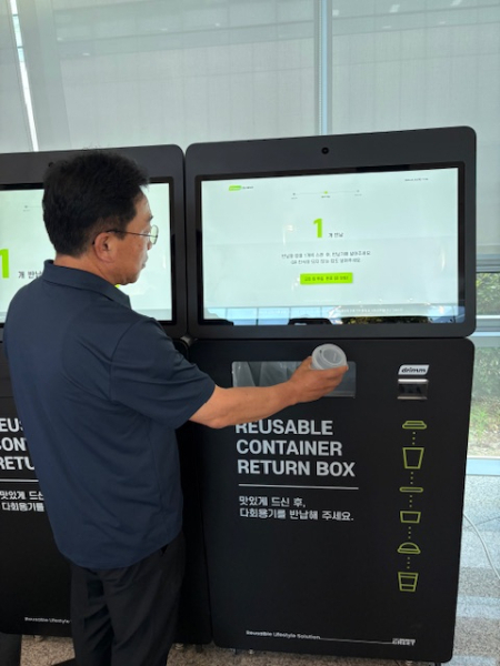 보증금제는 음료 구매 시 다회용컵을 선택하면 1000원의 보증금을 함께 내고, 음용 후 무인 회수기에 컵을 반납하면 보증금이 계좌이체를 통해 실시간 환급되는 구조다.