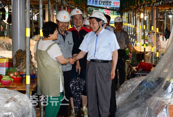 박용갑 중구청장은 25일 중구 산성시장 아케이드 공사현장을 방문, 전통시장상인들의 애로사항을 청취하고 공사관계자들을 격려했다.
