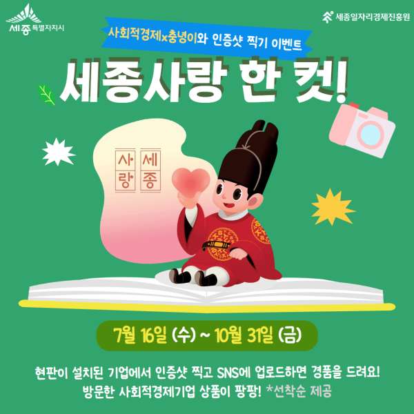 [충청뉴스 최형순 기자] 세종일자리경제진흥원(원장 이홍준)이 세종시 사회적경제기업에 대한 시민들의 관심과 참여를 높이기 위해 ‘세종사랑 한 컷! SNS 인증샷 이벤트’를 진행한다.