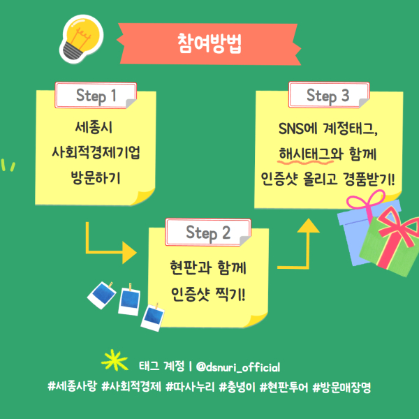 이때 지정된 해시태그(#세종사랑, #사회적경제, #따사누리, #충녕이)와 함께 따사누리 공식 계정(@dsnuri_official)을 반드시 태그해야 참여가 완료된다.