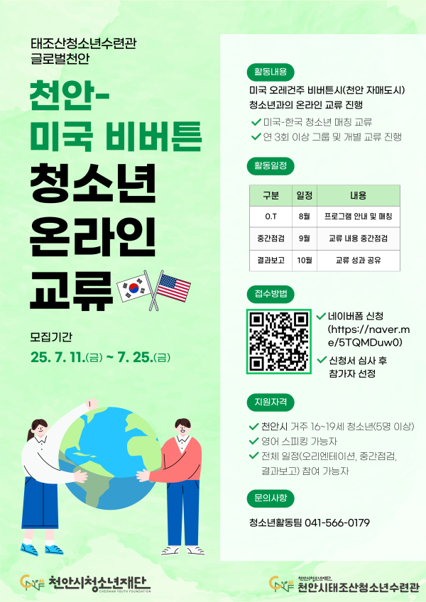 [충청뉴스 유규상 기자] (재)천안시청소년재단 천안시태조산청소년수련관은 미국 오레건주 비버튼시 청소년 온라인 국제교류 프로그램 참여자를 모집한다.