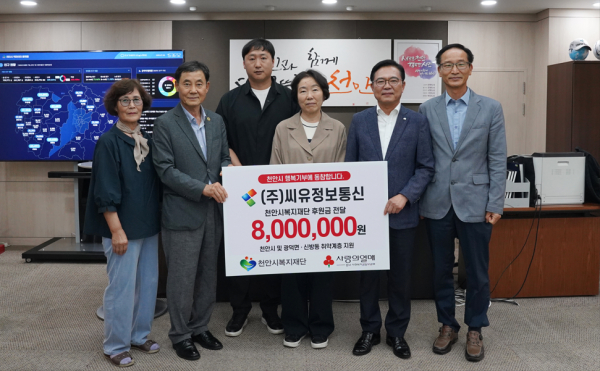 씨유정보통신이 18일 천안시복지재단에 천안지역 취약계층 주민들을 위한 후원금을 전달하고 있다.
