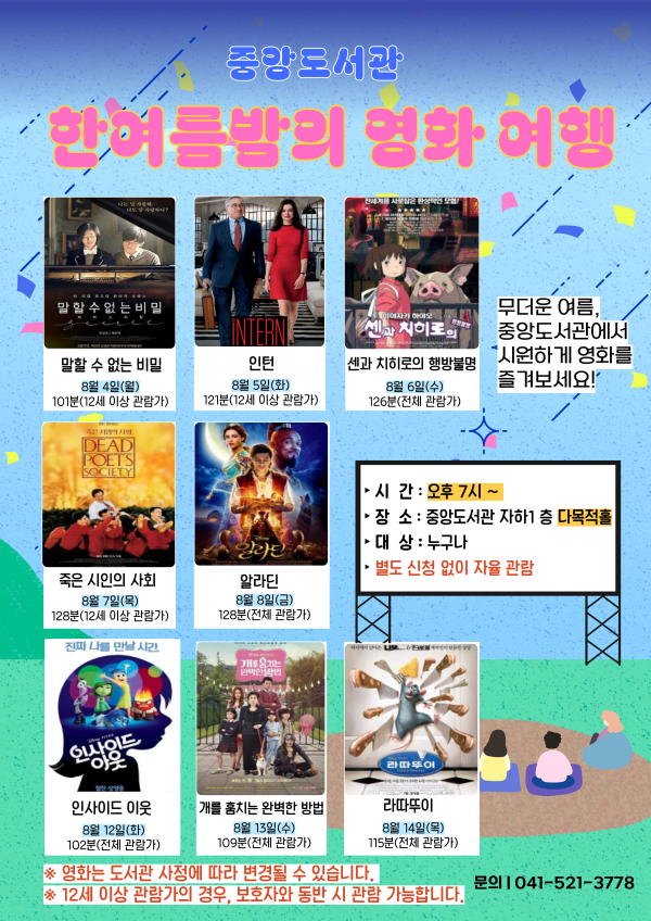 [충청뉴스 유규상 기자] 천안중앙도서관(관장 유정희)은 오는 8월 4~ 14일 영화 상영회 ‘한여름밤의 영화 여행’을 상영한다.